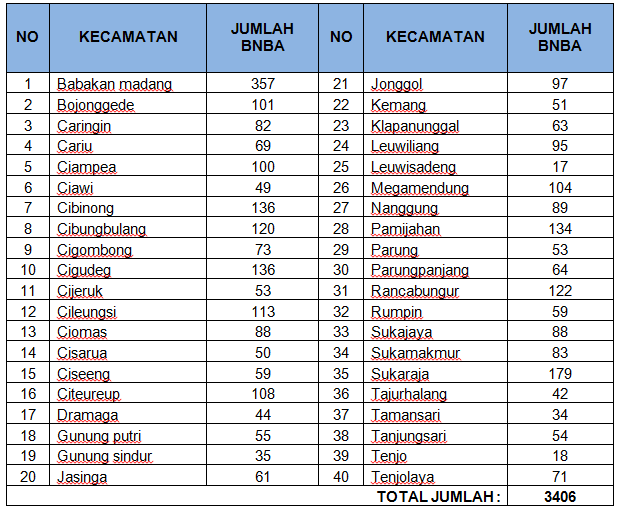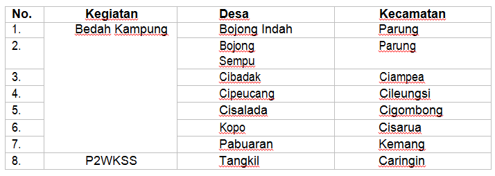 Melalui RP3KP, diharapkan Kabupaten Bogor dapat melaksanakan penanganan kawasan kumuh atau Kegiatan Peningkatan Kualitas Kawasan Permukiman Kumuh dengan Luas di Bawah 10 (sepuluh) Ha, Sub Kegiatan Pelaksanaan Peremajaan Kawasan Permukiman Kumuh (Sub Sub Kegiatan Bedah Kampung dan P2WKSS), dengan rincian lokasi sasaran kegiatan sebagai berikut :