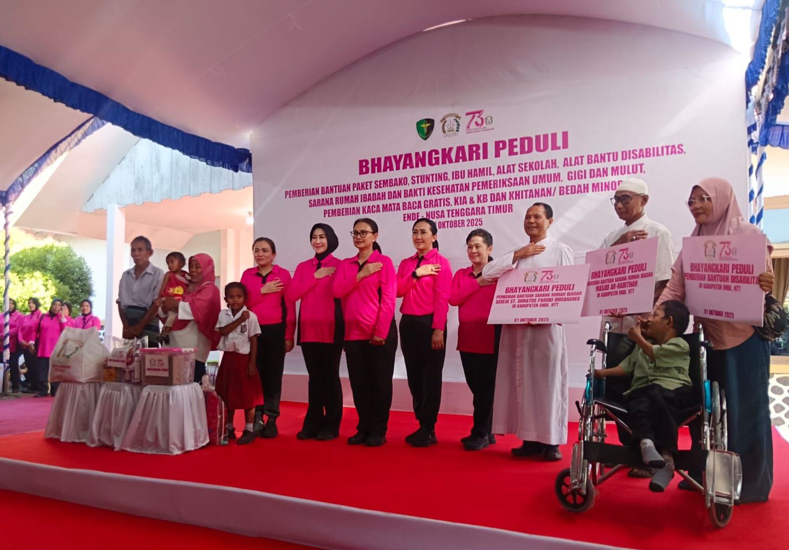 ENDE – GERBANG WARTA INDONESIA // Ketua Umum Bhayangkari, Ny. Julianti Sigit Prabowo, melaksanakan rangkaian kegiatan Bhayangkari Peduli di Kabupaten Ende, Nusa Tenggara Timur, Rabu (1/10/2025). Kegiatan ini meliputi penyaluran bantuan sosial, bakti kesehatan, serta bakti religi yang dipusatkan di halaman Kantor Camat Ende Utara, Kelurahan Kota Raja, Kecamatan Ende Utara.